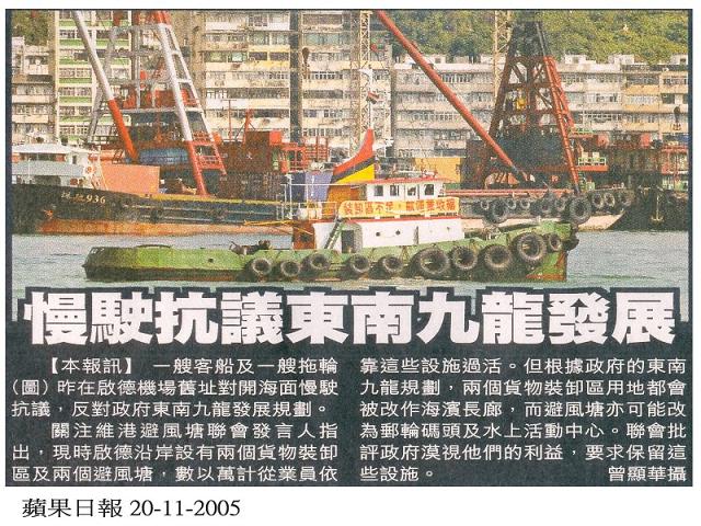 有見及此,本聯席會議經與會人士商討後,決議致函規劃署反映業界疑慮。此外,規劃署於2005年11月19日下午2時30分至5時,於前啟德機場跑道末端,舉辦之啟德規劃檢討第二階段公眾論壇,屆時參與公眾論壇之人士將可眺望官塘避風塘,故本聯席會議決議在官塘避風塘附近及海面上租用船隻,懸掛10條橫額表達本聯席會議及海面業界的心聲。